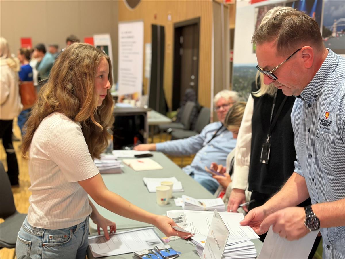 Elevene har med CV de kan gi til bedriftene de snakker med. Her gir Amelie Gonzalez sin til Ingar Løkkeberg Jansen i Fredrikstad kommune.