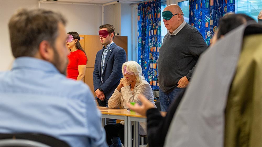 Det er tidlig morgen tirsdag 7. oktober. I et klasserom på Glemmen videregående skole i Fredrikstad har medlemmene i hovedutvalget for samferdsel, klima og miljø startet dagen med bind for øyene. Ingen stoler er satt frem, men det er bare å hente seg en. De fleste blir dog stående i hesteskoen rundt kursholder Ola Harald Svenning og funkiscoach Ragnhild Skovly Hartviksen fra Ekskurs, som forteller politikerne historier om utenforskap.