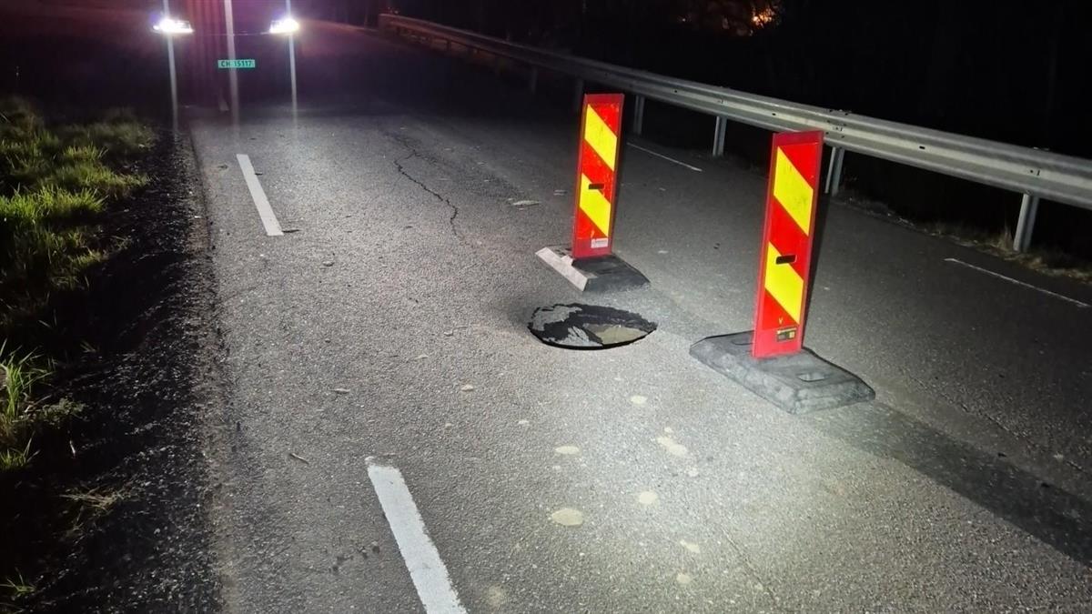 –Hullet er over 1 meter dypt, og det ser ut til å være hulrom under veikroppen. Dette kan være trafikkfarlig. Vår entreprenør er kontaktet, og veien stenges inntil videre. Vi håper å ha fått gjort nødvending utbedring i løpet av noen dager, sier byggeleder Khoshal Faqiri i Østfold fylkeskommunes drift- og vedlikeholdsavdeling.