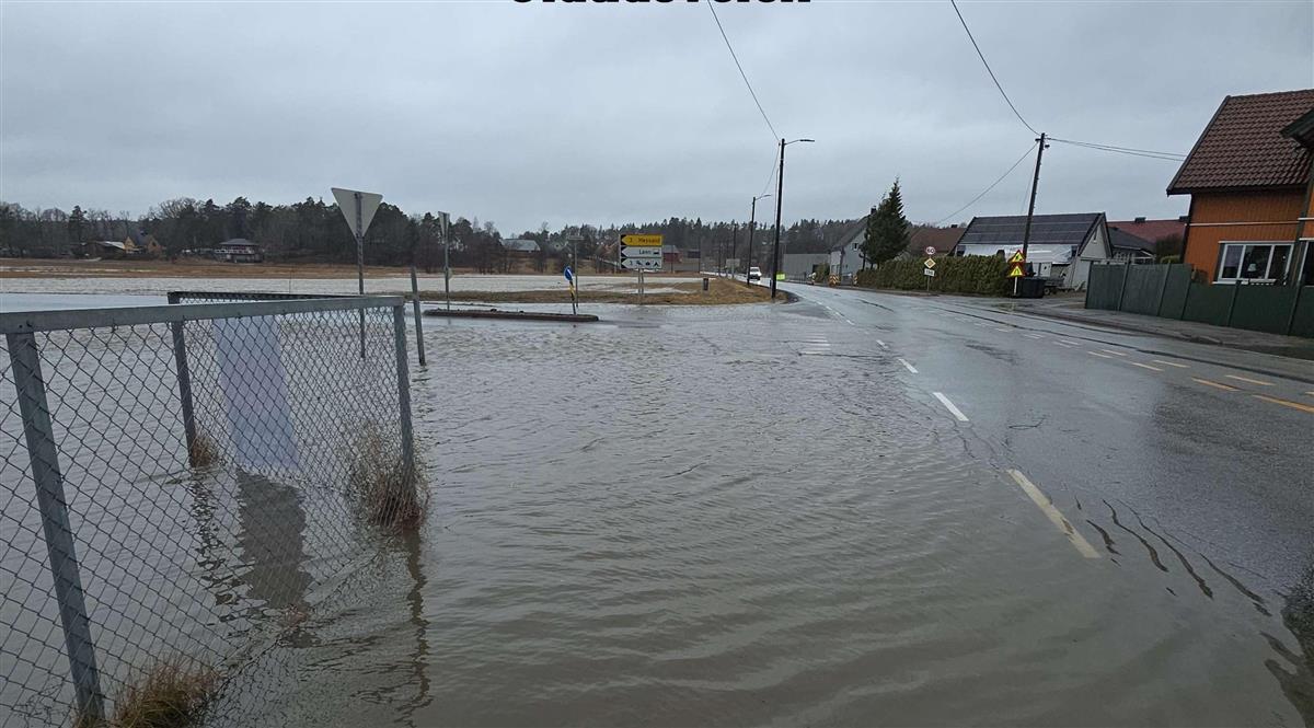 UTFORDRINGER: Regn og vind har gitt store utfordringer i trafikken 13. mars. Her fra fylkesvei 130 ved Skjeberg i Sarpsborg.