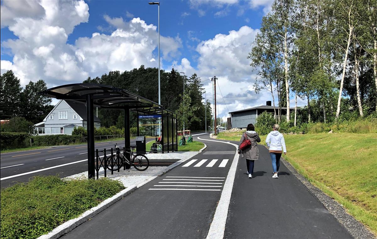 Busskur med sykkelparkering, samt sykkelvei med fortau - Klikk for stort bildeSykkelvei og fortau langs Skjebergveien i Sarpsborg Georg Ståle Brødholt, Østfold fylkeskommune