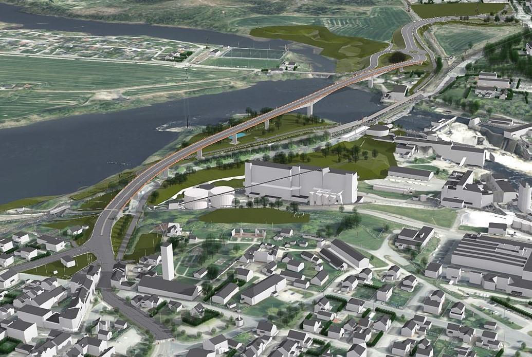 Illustrasjon av ny Sarpsbru - Klikk for stort bildeIllustrasjon fra planen for ny bru over Glomma ved Sarpsfossen Østfold fylkeskommune