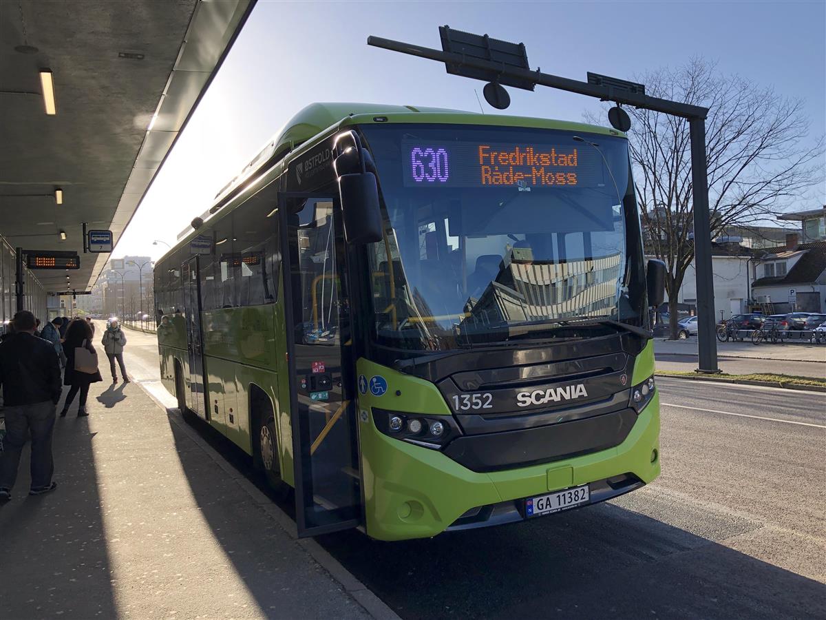 Grønn buss står ved en bussholdeplass - Klikk for stort bildeTilskudd til bussdrift er en stor post i fordeling av byvekstmidler Østfold fylkeskommune