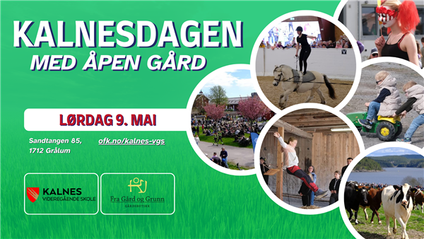 Gjør dere klare for en hyggelig og opplevelsesrik dag for hele familien!Lørdag 9. mai kl. 10–15 inviterer vi igjen til Kalnesdagen. Her blir det liv og røre, aktiviteter og gode opplevelser.