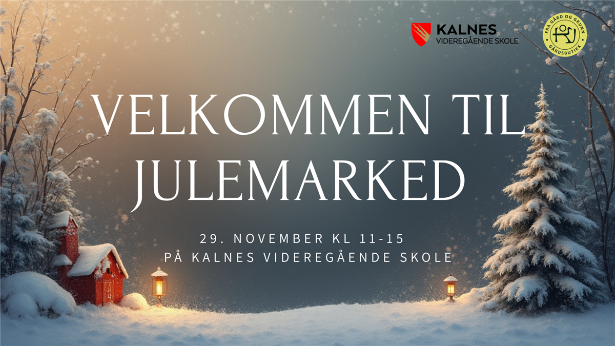 Velkommen til Julemarked ved tilrettelagt avdeling på Kalnes videregående skole!Dato: 29. novemberTid: Kl. 11.00 – 15.00Sted: Kalnes videregående skoleOpplev ekte julestemning med: Salg av varer produsert av ungdomsbedriften ved tilrettelagt avdeling på Kalnes vgs og andre lokale utstillere. Gårdsbutikken er åpen, fylt med flotte julevarer. Salg av sveler, kaffe og pølser.Gratis inngang og parkering! Ta turen innom for en hyggelig førjulshandel, støtt ungdomsbedriftene og kom i julestemning! Vi gleder oss til å se deg! Se vårt Facebookarrangement Publisert av Henrik Solgård Kirkeng Publisert 25.11.2025 13.44 Sist endret 25.11.2025 13.45