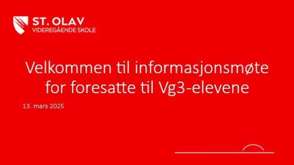 Vi ønsker dere velkommen til foreldremøte på St. Olav videregående skole.. Videregående skole innebærer nye faglige krav, større ansvar og flere valg for elevene. Nettopp derfor er samarbeidet mellom hjem og skole viktigere enn noen gang.
