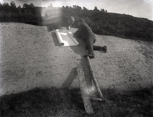 Arkeologen Sverre Marstrander gjorde en solid innsats for helleristningene mellom 1938 og 1946 – riktignok med en god dose krigsdramatikk involvert. Det var ganske heldig at han var ute på feltarbeid med helleristningene i Skjeberg en augustkveld i 1943. Da banket nemlig tyskerne på døra hjemme i Oslo! De hadde fått ordre om å arrestere alle reserveoffiserer. Marstrander pakket sammen både helleristningsutstyr, kone og barn og flyktet over grensen til Sverige.
