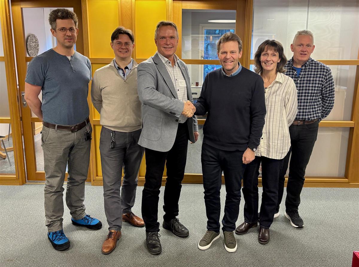 Teamet bak byggingen, sett fra venstre side. Fra entreprenøren, byggeleder Grzegorz Piechowski, avdelingsleder Edgaras Ramazauskas, direktør Ragnar Reitan, og fra fylkeskommunen, prosjektleder Arne-Rino Bergli, byggeleder Ingrid Vibeke Larsen og assisterende byggeleder Jon Ove Ebeltoft.